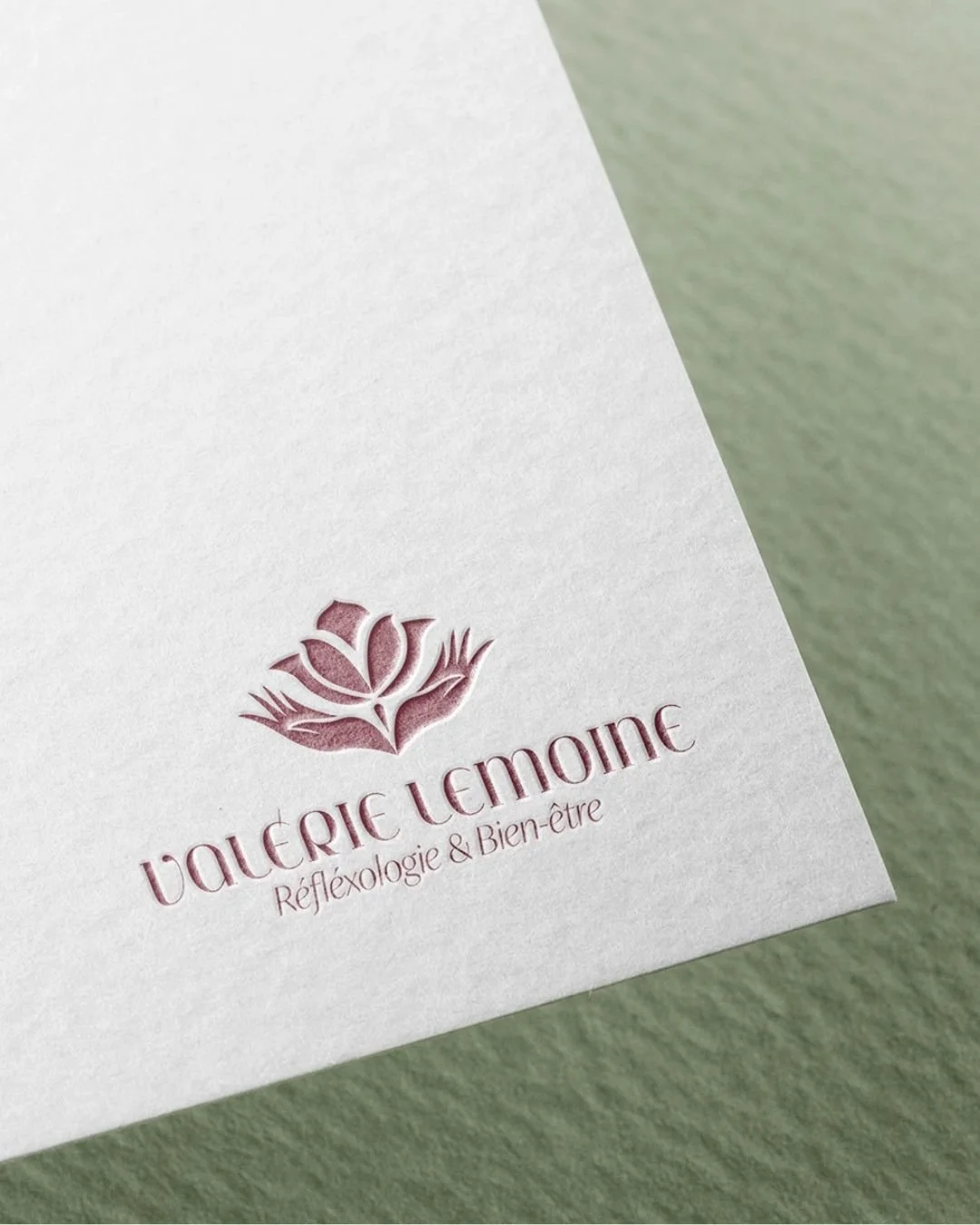 Le logo, une fleur de lotus stylisée entre deux mains, traduit parfaitement la philosophie de Valérie : le bien-être ancré dans l’humain, délicat et enveloppant.